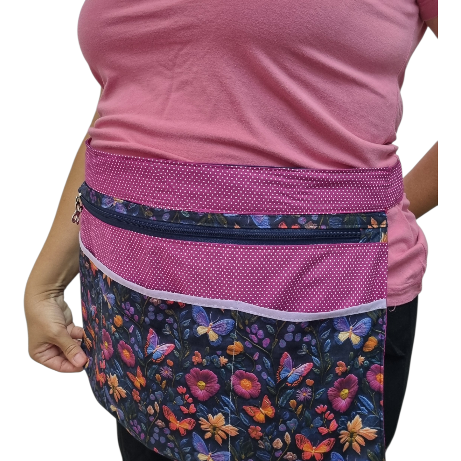 Avental em tecido, com bolsinhos que permitem levar seu celular, caneta, papel e outros itens que sempre precisamos ter em mãos para os cuidados com os pequenos fora da sala de aula.