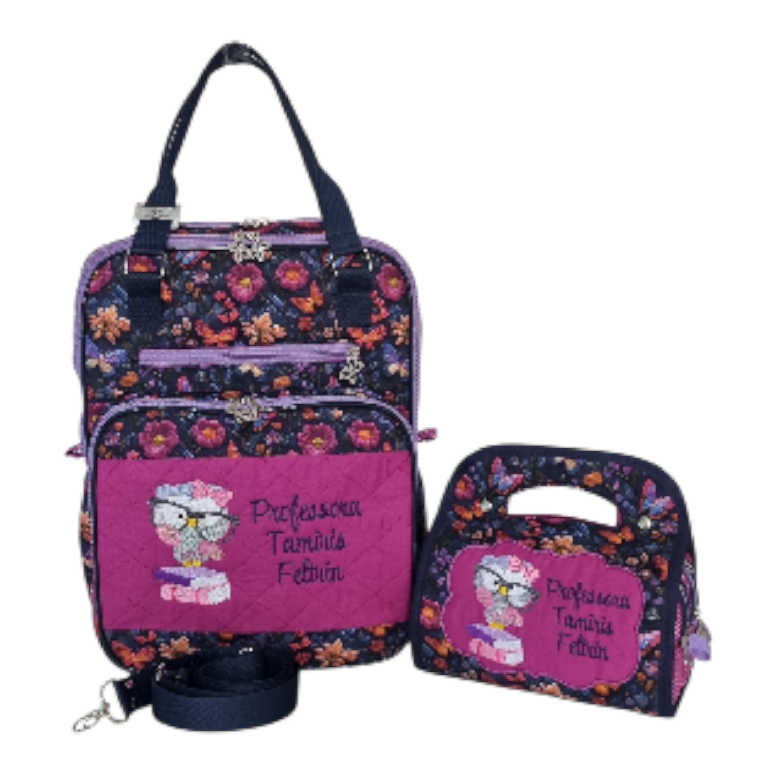 Uma bolsa com divisões com alcas de mão e alças de costas para facilitar o transporte de seus materiais. Tem bolsos externos, inclusive para garrafinhas.