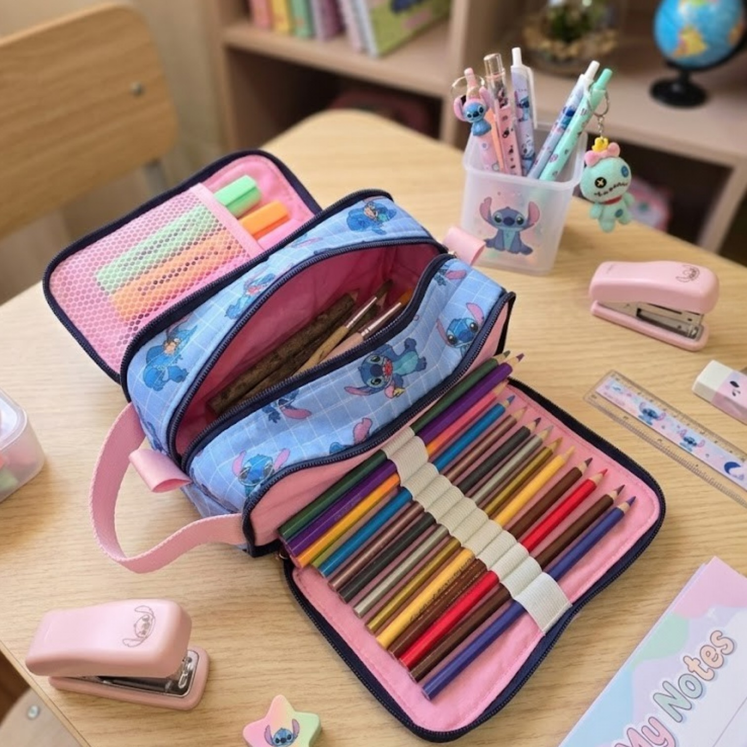 Um bolso com zíper para os objetos mais utilizados como borracha, apontador, cola bastão e tesoura.