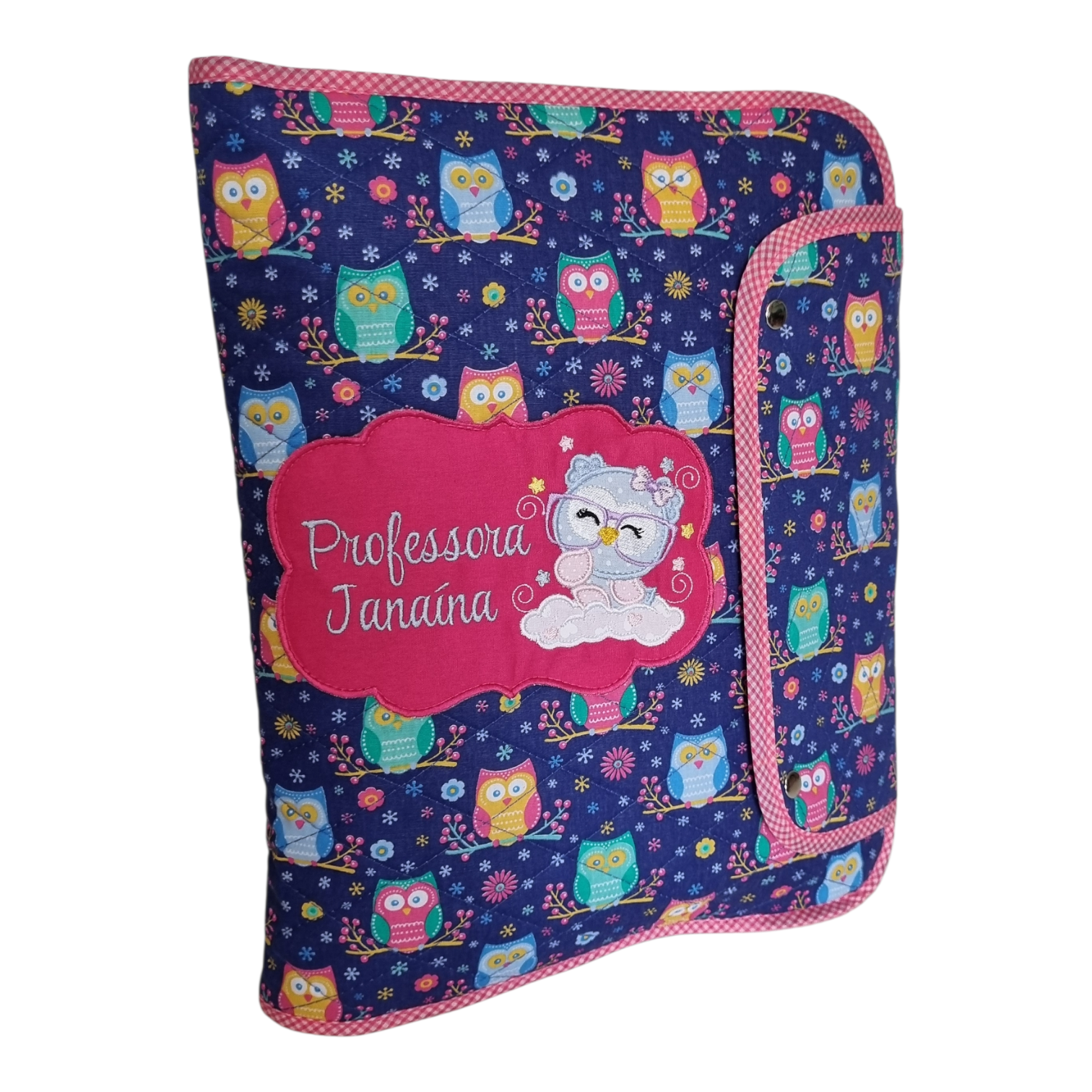 A pasta universitária é confeccionada em tecido e material estruturador. Linda e prática, com várias divisórias para manter tudo organizado.