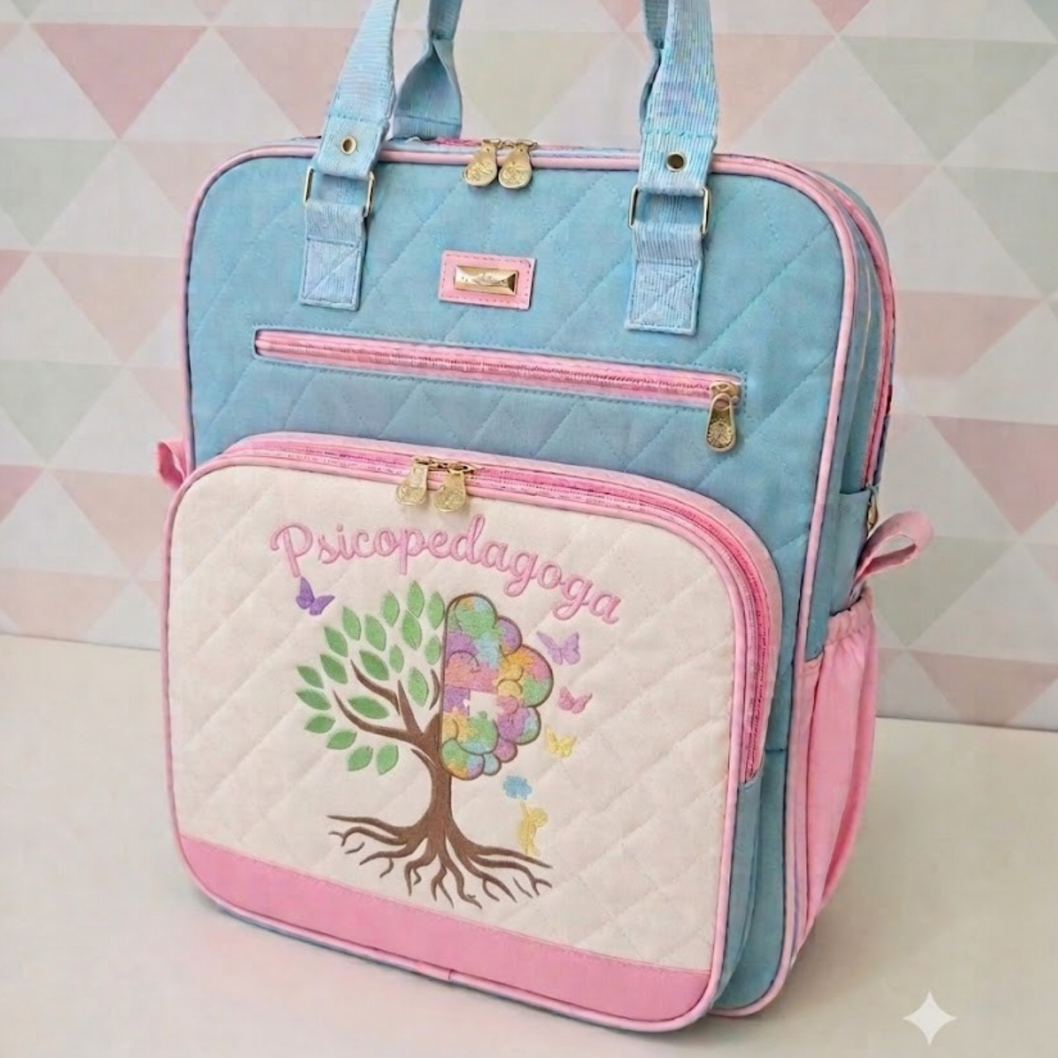 Uma bolsa com divisões com alcas de mão e alças de costas para facilitar o transporte de seus materiais. Tem bolsos externos, inclusive para garrafinhas.